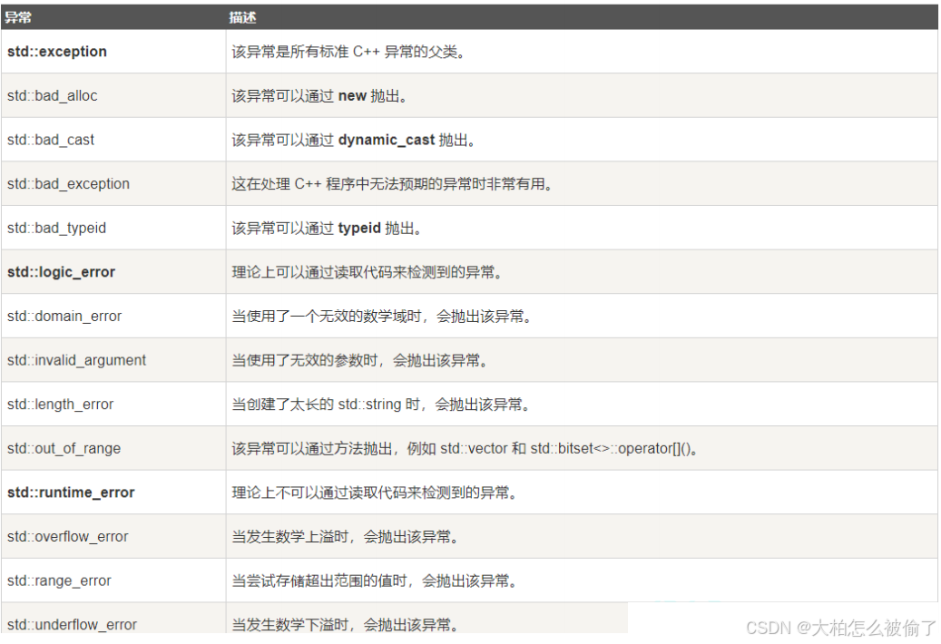 - 异常规格说明的目的是为了让函数使用者知道该函数可能抛出的异常有哪些,可以在函数的后面接throw(类型),列出这个函数可能抛掷的所有异常类型。