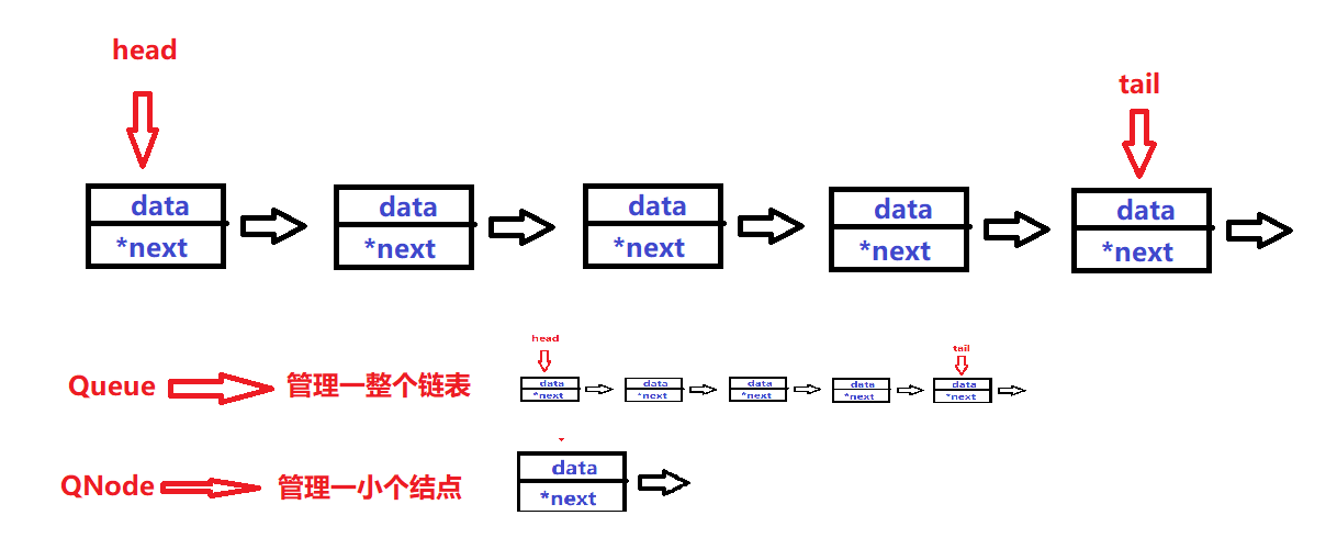 - 队列有两个指针,一个指针指向链表头结点,一个指针指向链表最后一个结点;