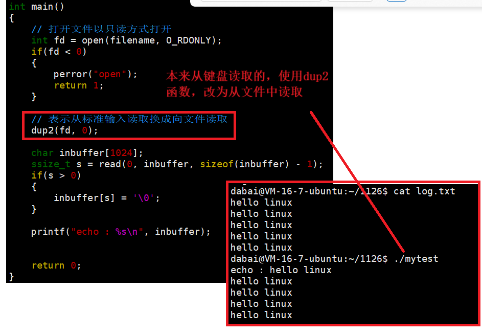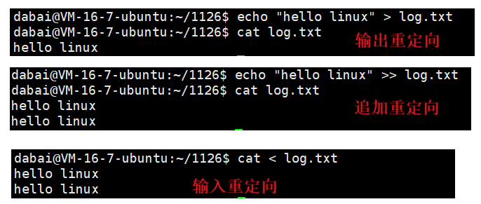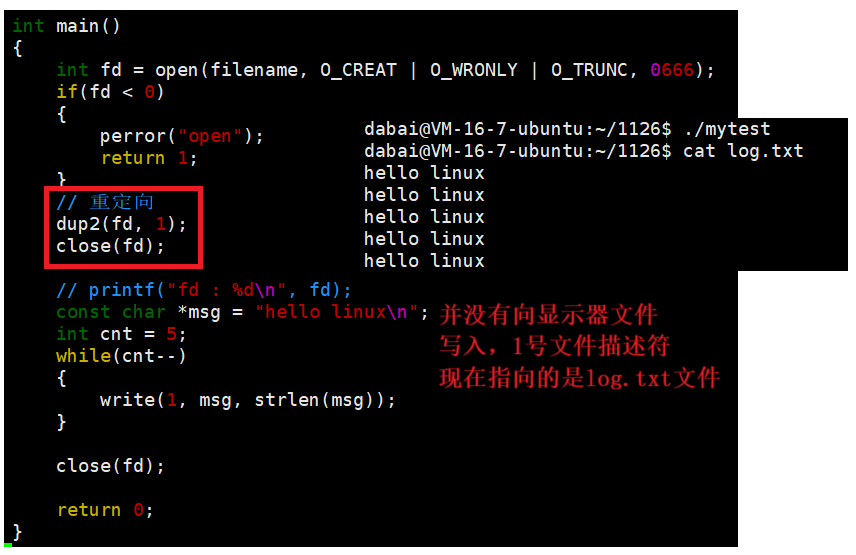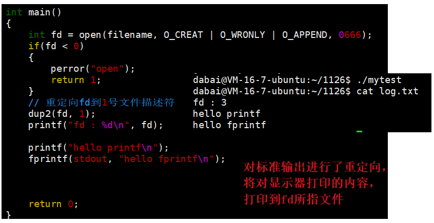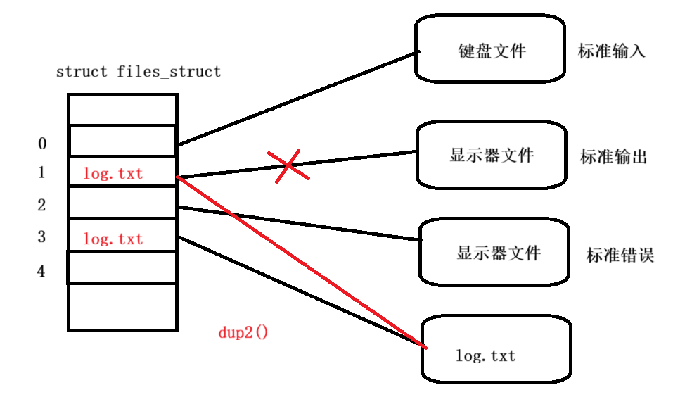 Linux下一切皆文件,本来应该向显示器文件写入的内容,写到了log.txt文件中,这种情况就类似于输出重定向。