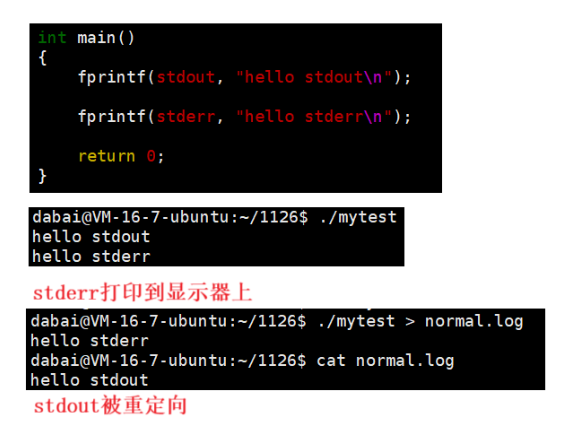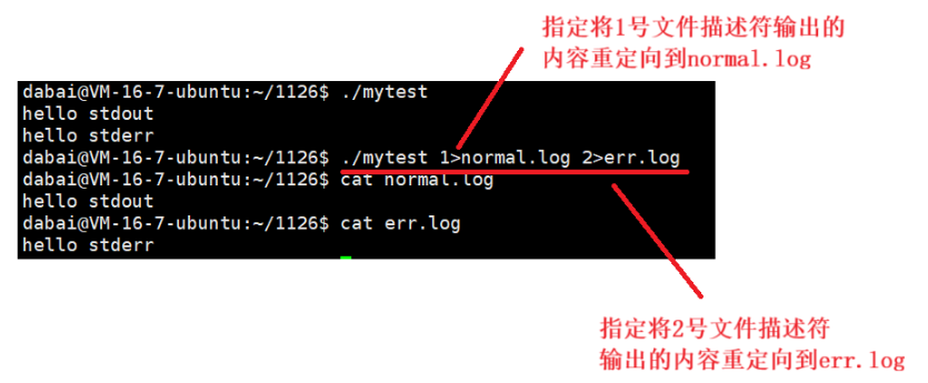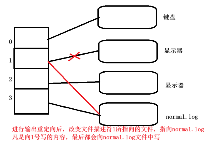 stdout底层的文件描述符是1,stderr底层的文件描述符是2。重定向后,会将向stdou输出的内容输出到normal.log文件中;而向stderr文件中写的内容,还是会向显示器输出。