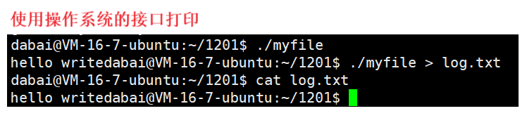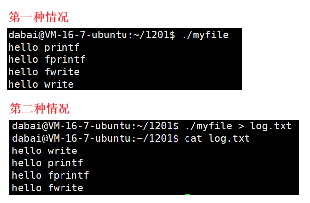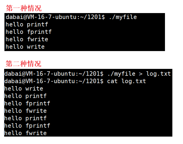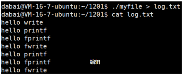 出现了一种特殊的情况,将执行重定向到文件中,log.txt文件中出现了7行内容,C语言接口被打印两次,而操作系统接口被打印1次。