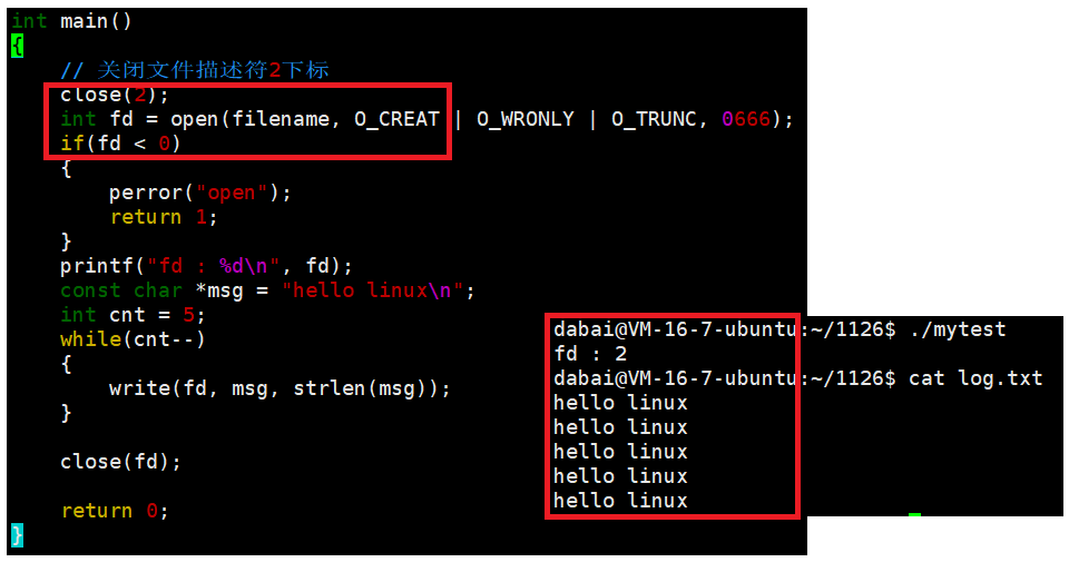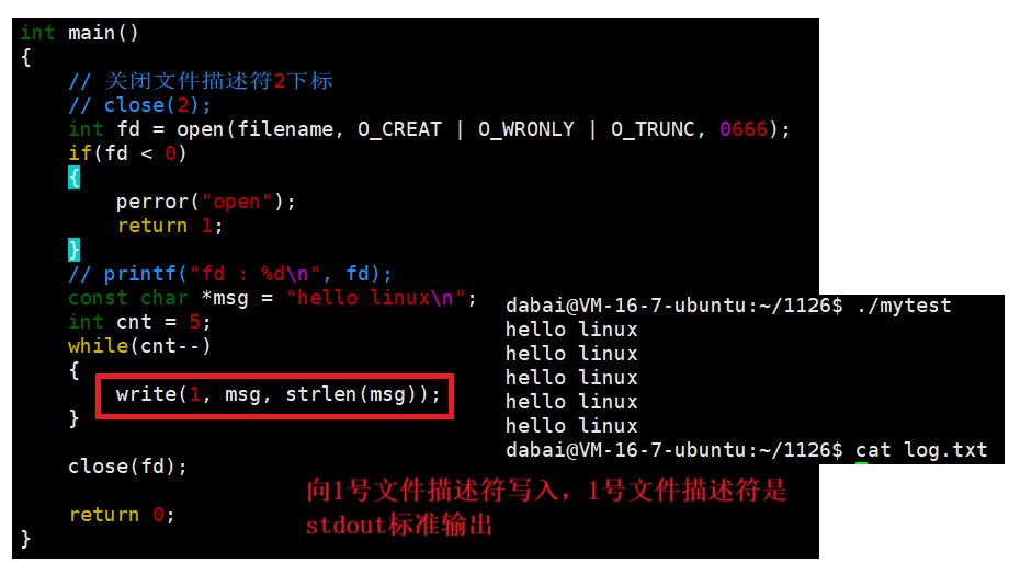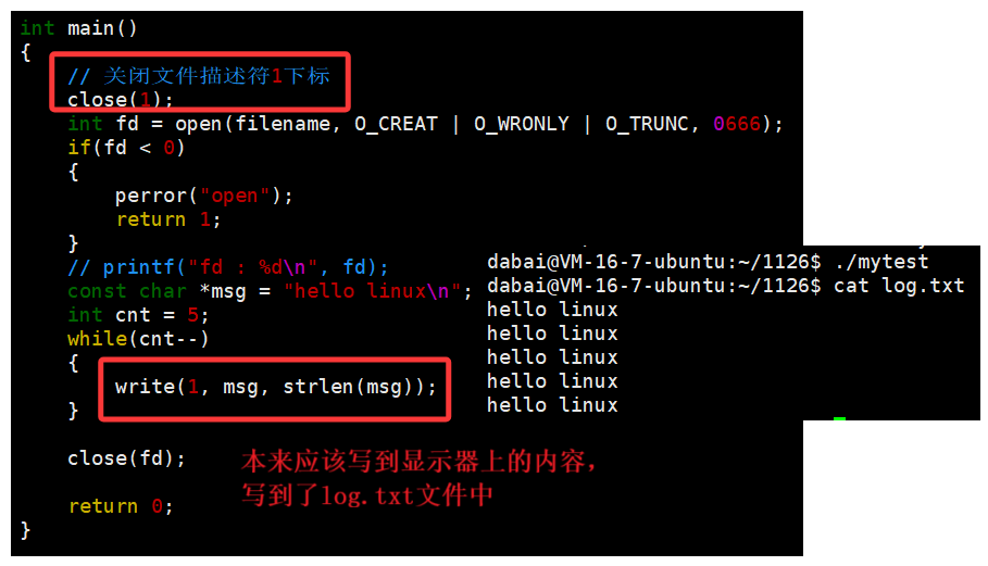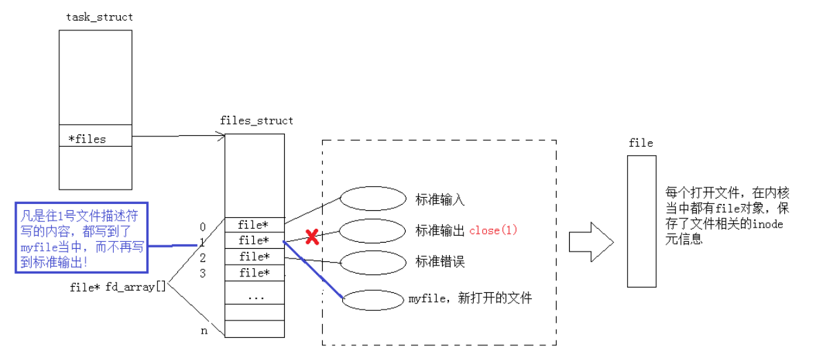 - 后续再向1号文件描述符写内容时,就是向新打开的文件中写入。