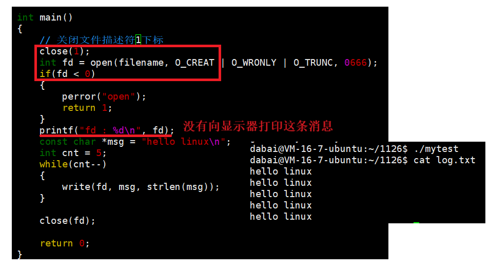 - 先将1号文件描述符关闭,说明将1号的显示器文件关闭,1号文件描述符就被空出来了。