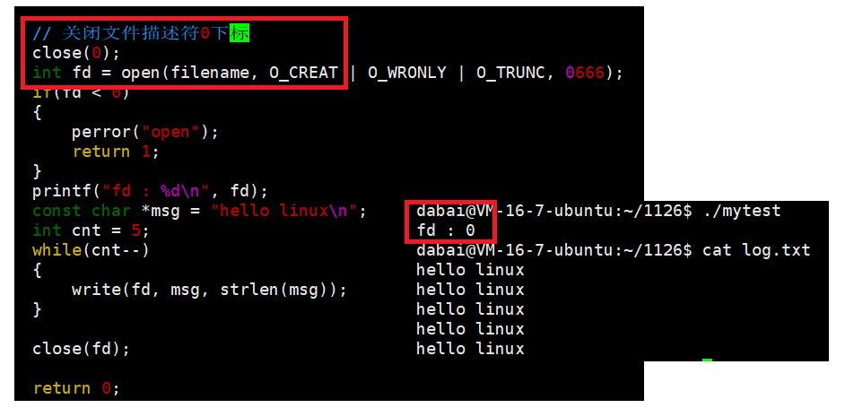 文件描述符对应的分配规则是,从0下标开始,寻找最小的没有被使用的数组位置,其下标就是新文件的文件描述符。