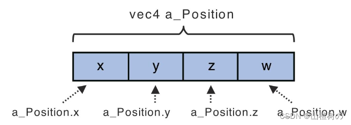 上面进行平移变换时,齐次坐标的x、y、z、w分量是作为整体进行加法运算的;而进行旋转变换时,为了计算等式R4,需要单独访问a_Position的每个分量。我们使用点操作符“.”来访问分量,如a_Position.x、a_Position.y或a_Position.z(如下图所示)。