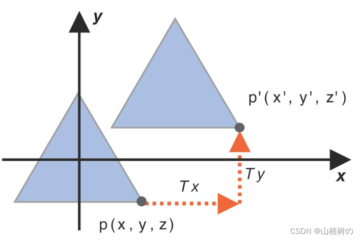 考虑一下,为了平移一个三角形,你需要对它的每一个顶点做怎样的操作?答案是,你需要对顶点坐标的每个分量(x和y),加上三角形在对应轴(如X轴或Y轴)上平移的距离。比如,将点p(x,y,z)平移到p' (x',y',z'),在X轴、Y轴、Z轴三个方向上平移的距离分别为Tx,Ty,Tz,其中Tz为0。