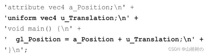 因为Tx、Ty、Tz对于所有顶点来说是固定(一致)的,所以我们使用uniform变量u_Translation来表示三角形的平移距离。首先,获取uniform变量的存储位置: