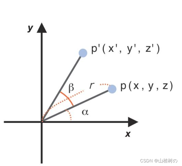 上面我们计算了平移的数学表达式,现在来看旋转的数学表达式。根据下图,假设点p(x,y,z)旋转β角度之后变为了点p'(x',y',z'):首先旋转是绕Z轴进行的,所以z坐标不会变,可以直接忽略;然后,x坐标和y坐标的情况有一些复杂。