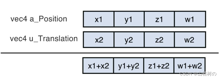 因为a_Position和u_Translation变量都是vec4类型的,所以你可以直接使用+号,两个的矢量的对应分量会被同时相加,如下图所示。方便的矢量相加运算是GLSL ES提供的特性之一。