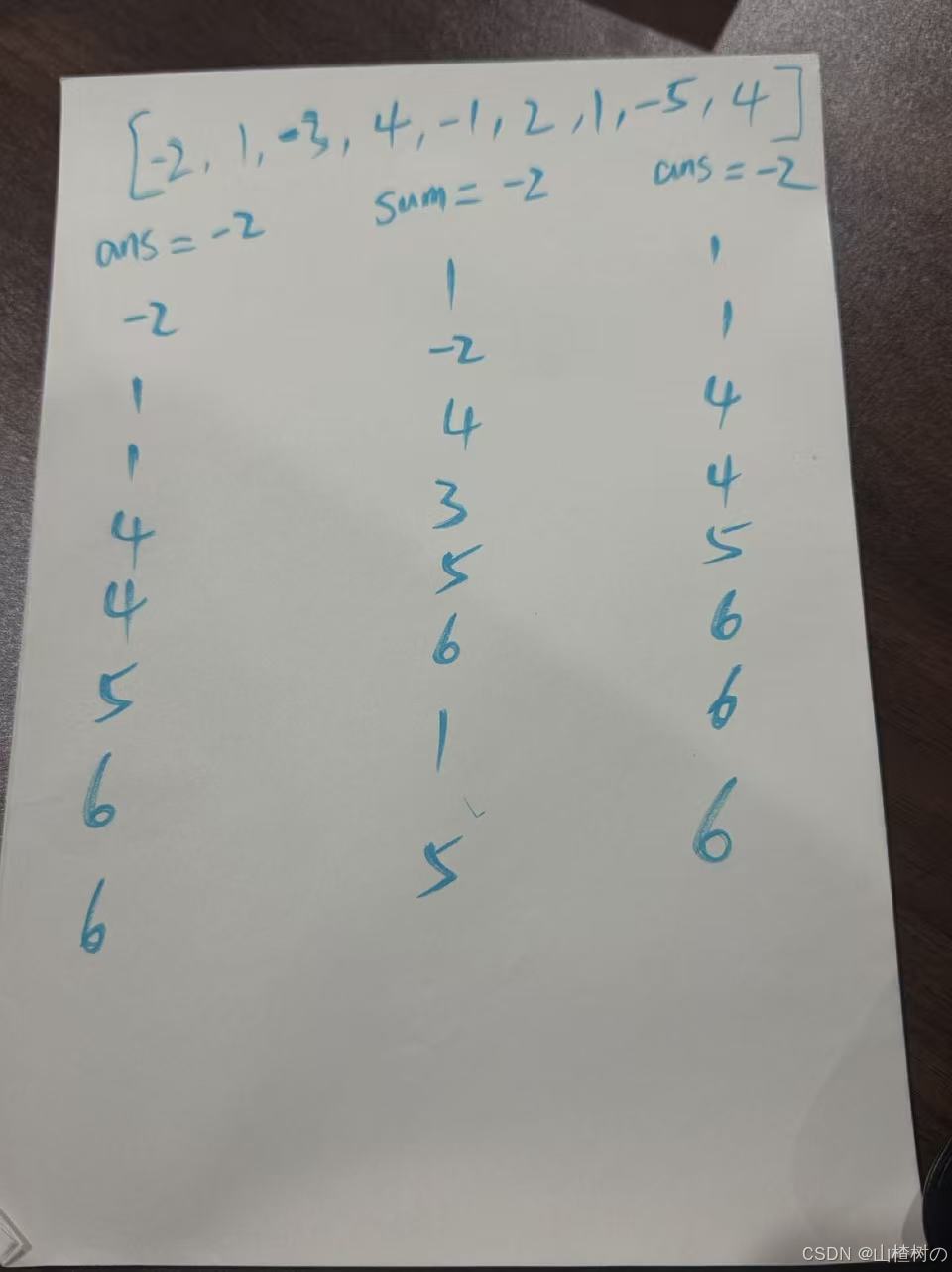- 每次比较 sum 和 ans的大小,将最大值置为ans,遍历结束返回结果