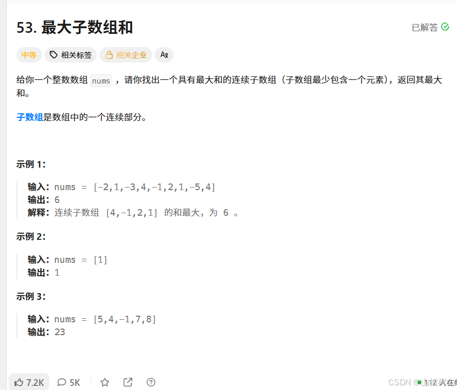 Kadane算法(动态规划解法),用于求解最大子数组和问题。(要求时间复杂度为O(n))