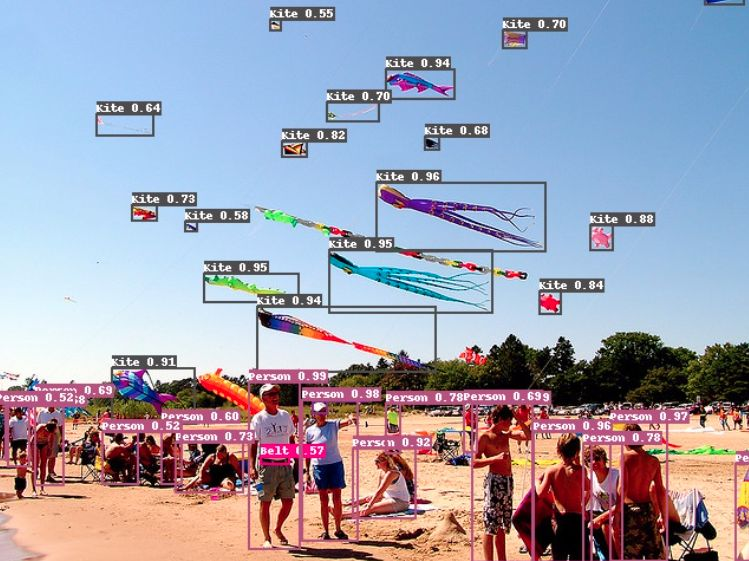 此外,在模型训练过程中,团队引入了多尺度训练、动态采样等训练技巧;在计算预测边框的损失函数时,使用Libra loss[10]替代传统的Smooth L1 loss,用于平衡不同难度的预测框之间的损失函数;由于OIDV5和Objects365数据集[11]大约有189个公共类,因此使用Object365数据集对OIDV5数据集进行扩充;在预测时,使用SoftNMS进行后处理[12],保证更多的检测框可以被召回。基于飞桨,该模型在8卡V100(32G)机器上训练之后,最终该单模型(多尺度预测)的得分为0.6492/0.6182。模型的检测效果如下。