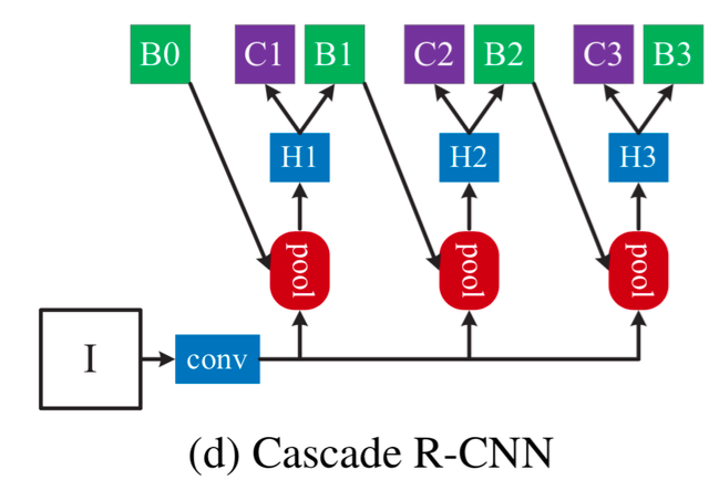 Cascade RCNN可以帮助检测器获得更加精确的检测结果。其结构如下所示[4],通过逐渐提升预测框和标注边框的匹配交并比,并不断修正检测框的位置和得分。标准的Cascade RCNN结构只预测前景框和背景框的偏移量,团队在比赛中做了修改,对每个类别都单独预测了一个偏移量。