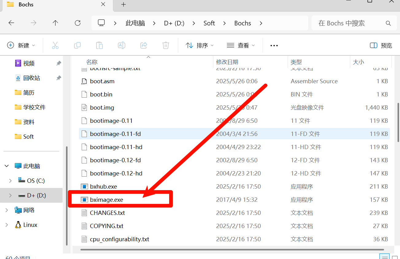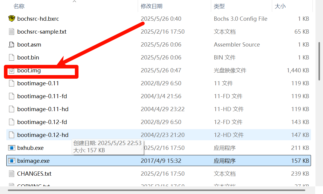 这里可以随便写名字我写的是boot.asm,这个文件放到Nasm编译工具中。注意编译好的文件boot.bin要放在bochs根目录下,因为方便使用dd工具进行写入我们的boot.img软盘镜像