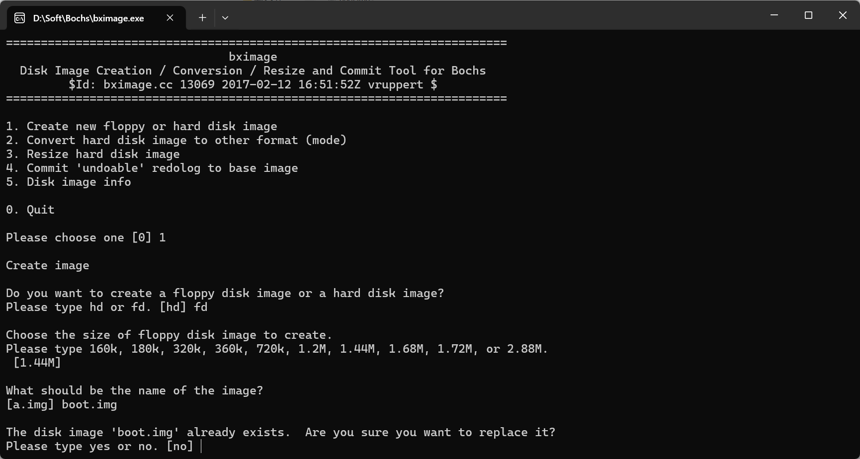 dd if="D:\Soft\Bochs\boot.bin" of="D:\Soft\Bochs\boot.img" bs=512 count=1 conv=notrunc