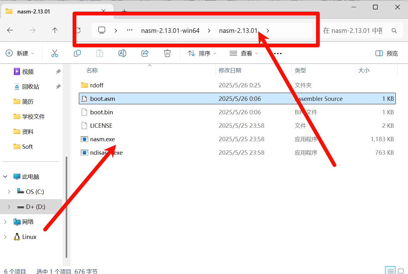 打开当前目录的cmd,在nasm工具中编译,并输入命令,主要是有这个exe文件就可以使用相关命令(因为什么因为由这个nasm.exe工具,除非配到windows的环境变量当中,或者加入windows的系统变量当中,否则必须在这个目录下,要不然傻乎乎的计算机不认识这个nasm命令.......)