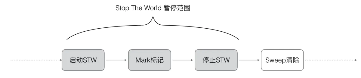 Go V1.3 做了简单的优化,将STW提前, 减少STW暂停的时间范围.如下所示
