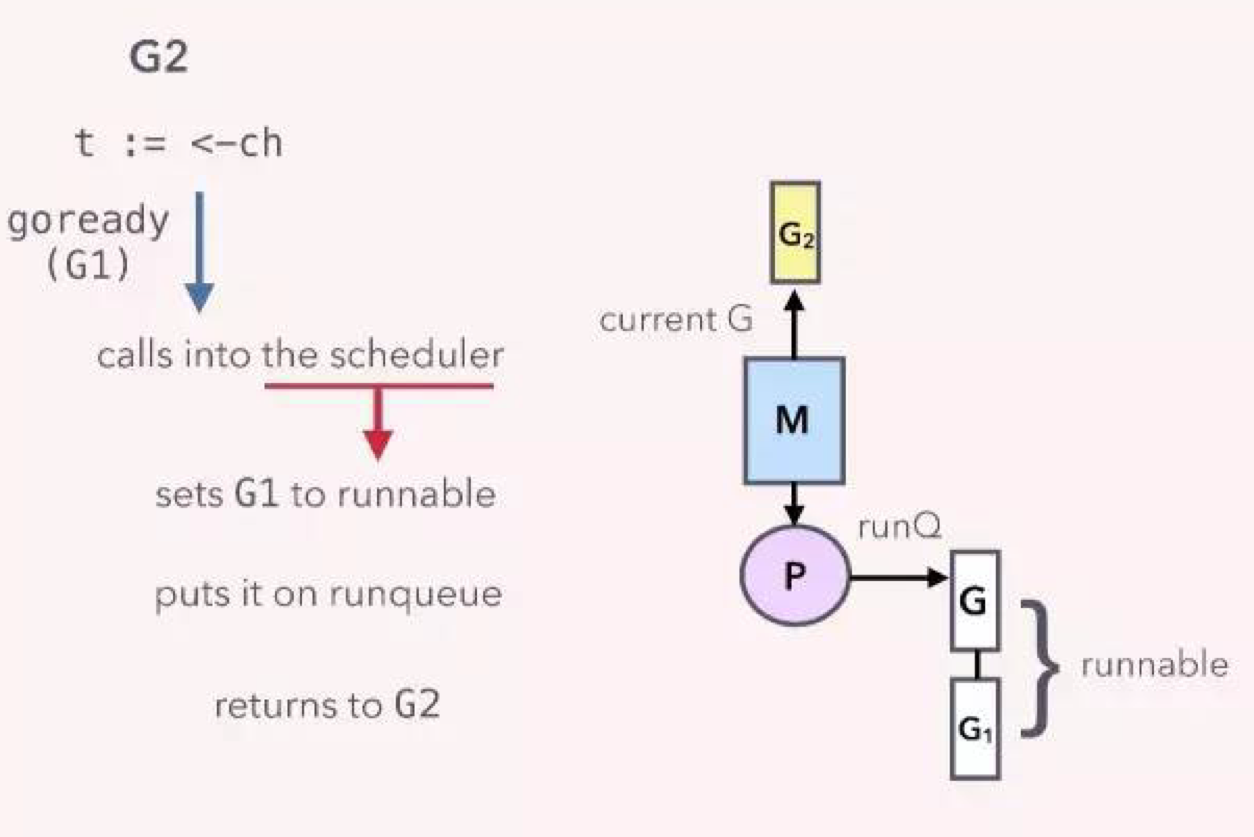 当G2从ch中接收一个数据时,会通知调度器,设置G1的状态为runnable,然后将加入P的runqueue里,等待线程执行.