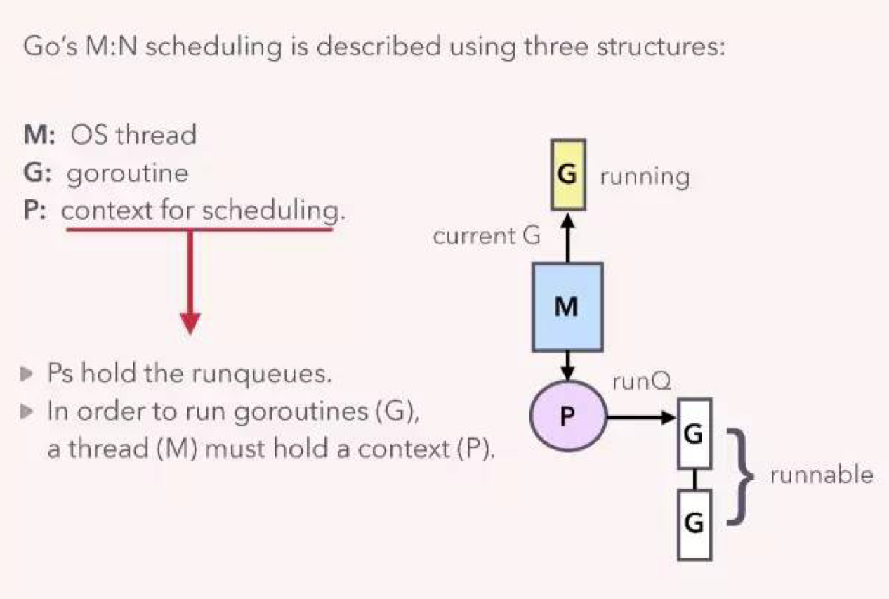 其中M是操作系统的线程,G是用户启动的goroutine,P是与调度相关的context,每个M都拥有一个P,P维护了一个能够运行的goutine队列,用于该线程执行。