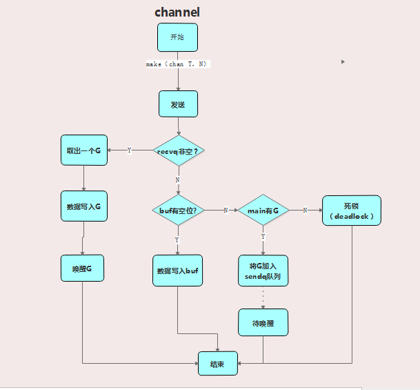 - 如有等待的goroutine,没有缓冲区,取出goroutine并读取数据,然后唤醒这个goroutine,结束读取释放锁。