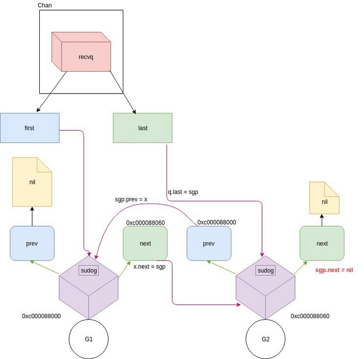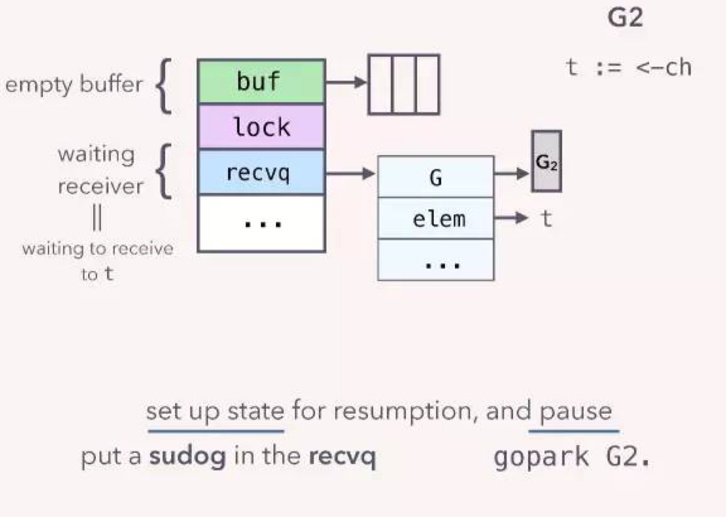 前面我们是假设G1先运行,如果G2先运行会怎么样呢?如果G2先运行,那么G2会从一个empty的channel里取数据,这个时候G2就会阻塞,和前面介绍的G1阻塞一样,G2也会创建一个sudog结构体,保存接收数据的变量的地址,但是该sudog结构体是放到了recvq列表里,当G1向ch发送数据的时候,runtime并没有对hchan结构体题的buf进行加锁,而是直接将G1里的发送到ch的数据copy到了G2 sudog里对应的elem指向的内存地址!
