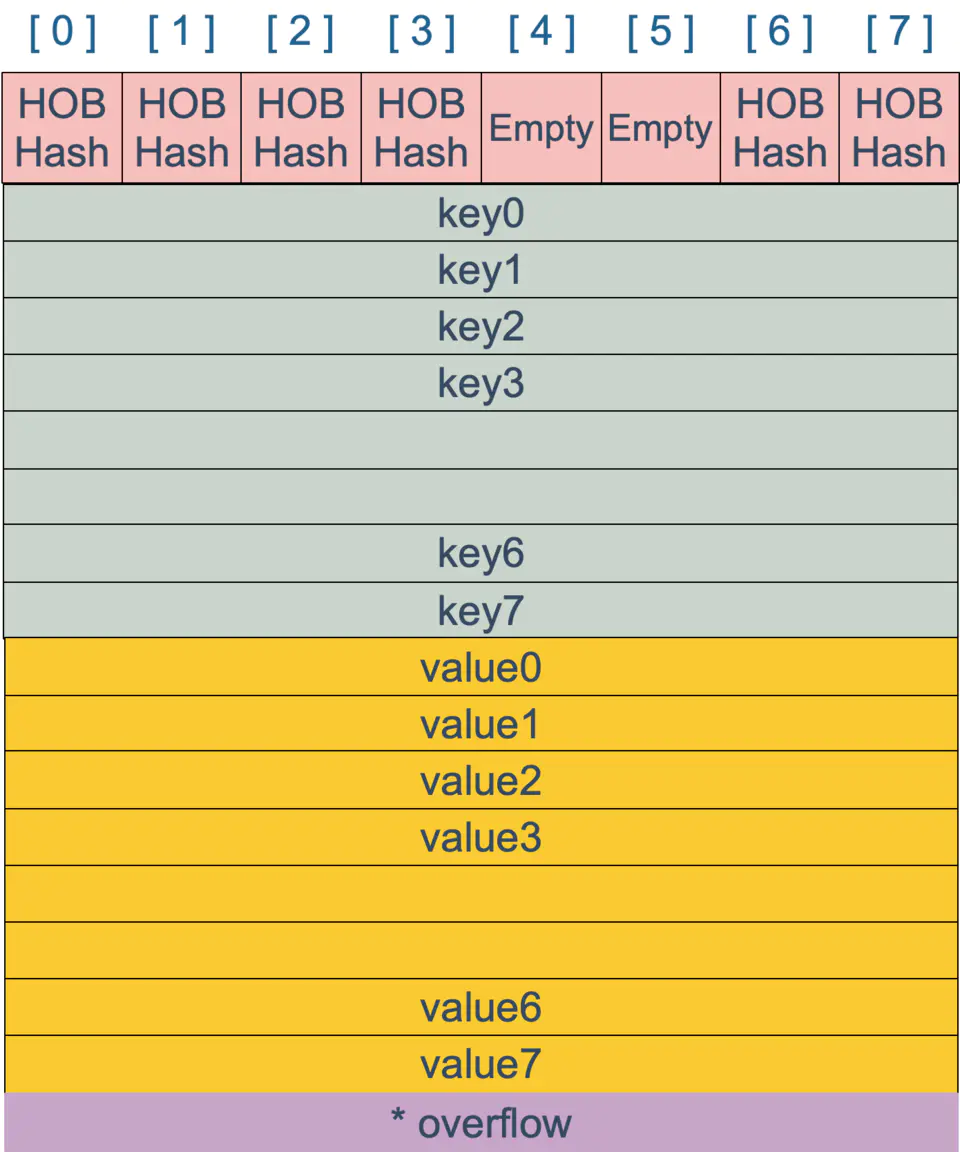 上图就是 bucket 的内存模型,HOB Hash 指的就是 top hash。 注意到 key 和 value 是各自放在一起的,并不是 key/value/key/value/... 这样的形式。源码里说明这样的好处是在某些情况下可以省略掉 padding 字段,节省内存空间。