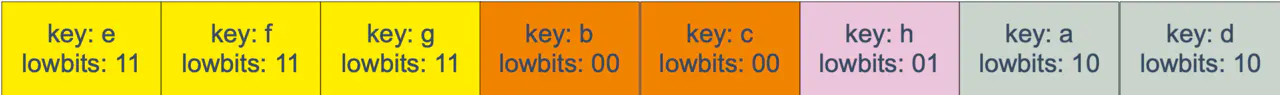 bmap 就是我们常说的“桶”,桶里面会最多装 8 个 key,这些 key 之所以会落入同一个桶,是因为它们经过哈希计算后,哈希结果是“一类”的。在桶内,又会根据 key 计算出来的 hash 值的高 8 位来决定 key 到底落入桶内的哪个位置(一个桶内最多有8个位置)。