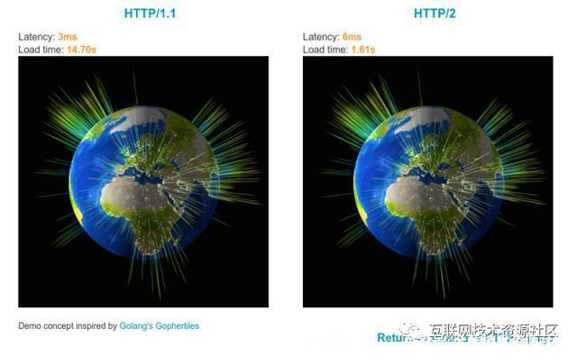 这个Akamai公司建立的一个官方的演示,使用HTTP/1.1和HTTP/2同时请求379张图片,观察请求的时间,明显看出HTTP/2性能占优势。