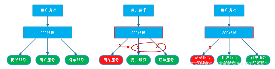 假设系统存在商品服务、用户服务和订单服务3个微服务,通过设置运行时环境得到3个服务一共使用200个线程,客户端调用这3个微服务共享线程池时可能会引发服务雪崩,将线程分别隔离后则不会触发整体雪崩。