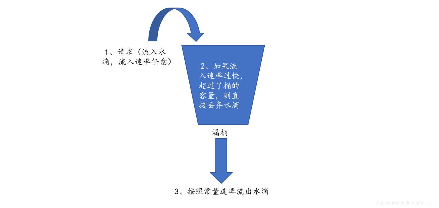 - 如果流入水滴超出了桶的容量,则流入的水滴溢出了(被丢弃),而漏桶容量是不变的。