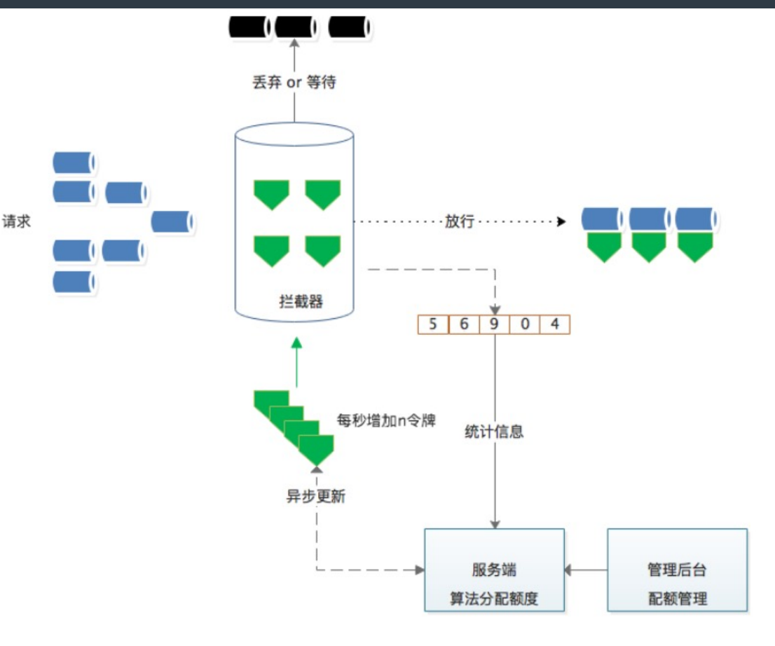 - 每次心跳后,异步批量获取 quota,可以大大减少请求 redis 的频次,获取完以后本地消费,基于令牌桶拦截。