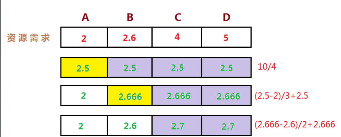 直观上,公平分享分配给每个用户想要的可以满足的最小需求,然后将没有使用的资源均匀的分配给需要‘大资源’的用户。