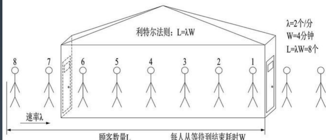 如上图所示,如果我们开一个小店,平均每分钟进店 2 个客人(λ),每位客人从等待到完成交易需要 4 分钟(W),那我们店里能承载的客人数量就是 2 * 4 = 8 个人
