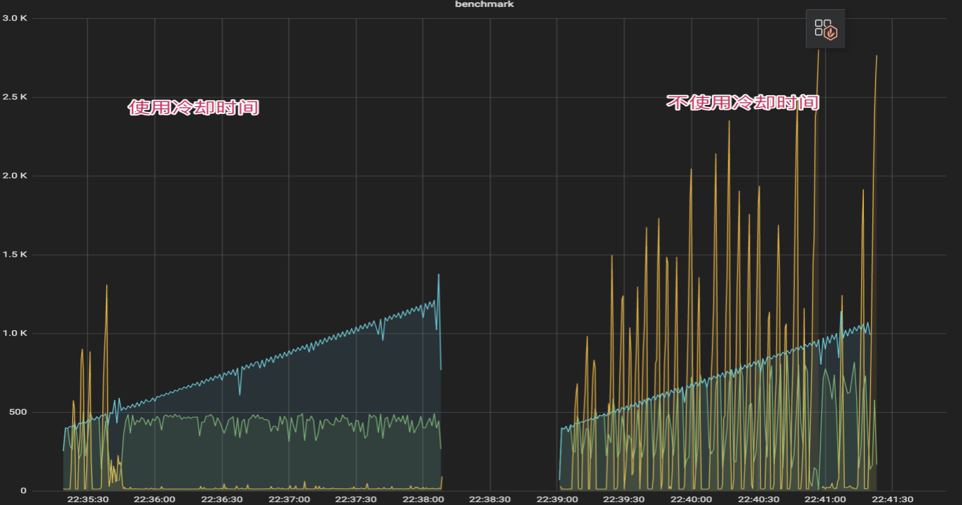 - 限流效果生效后,CPU 会在临界值(800)附近抖动,如果不使用冷却时间,那么一个短时间的 CPU 下降就可能导致大量请求被放行,严重时会打满 CPU。