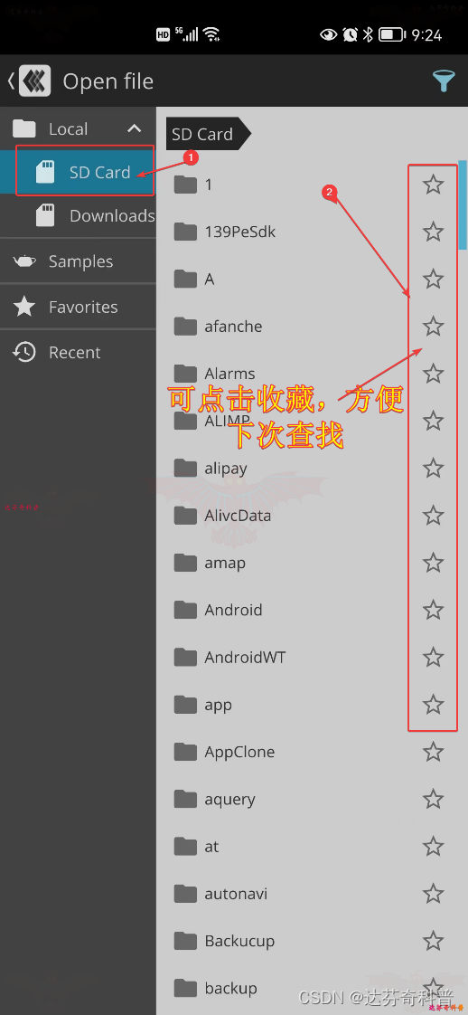 步骤1, 下载apk到手机后直接安装, 打开软件,见下图,点击SD卡,然后查找文件夹,选择相应的文件打开即可;(提示:手机文件比较多,不好查找,可点击右侧的收藏功能,方便下次查找)。