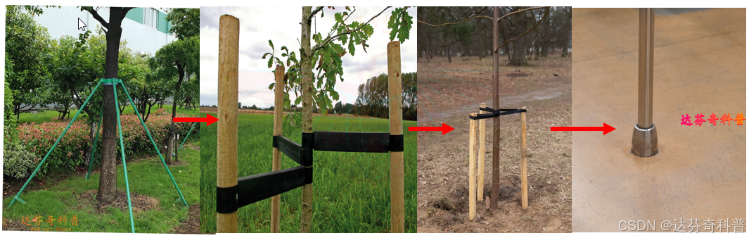 达芬奇不禁对上述发问进行了思考,进行了简单的逆向思考。首先从从功能上分析,扶杆的功能主要是满足车厢乘客流量大时,乘客抓扶支撑作用;那么此处“圆锥体”很有可能与此功能有关,应该是支撑作用;我想到了常见的路边的绿化植物,为了防止树的倾倒,经常会进行如下所示的支撑;这个“圆锥体”是否就有此功能呢?