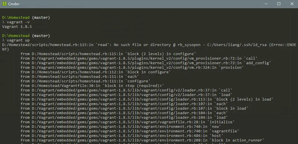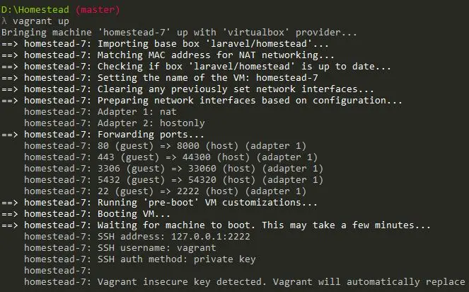 在 Homestead 目录下运行vagrant up命令,Vagrant 将会启动虚拟机并自动配置共享文件夹以及 Nginx 站点。官方文档对此描述的如此这般简单,其实这里遇到了第二个大坑