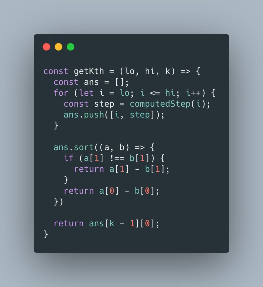 区间内的数按权重排序以后的结果为 [12,13,14,15] 。对于 k = 2 ,答案是第二个整数也就是 13 。