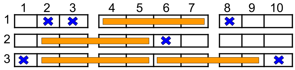 输入:n = 3, reservedSeats = [[1,2],[1,3],[1,8],[2,6],[3,1],[3,10]]
