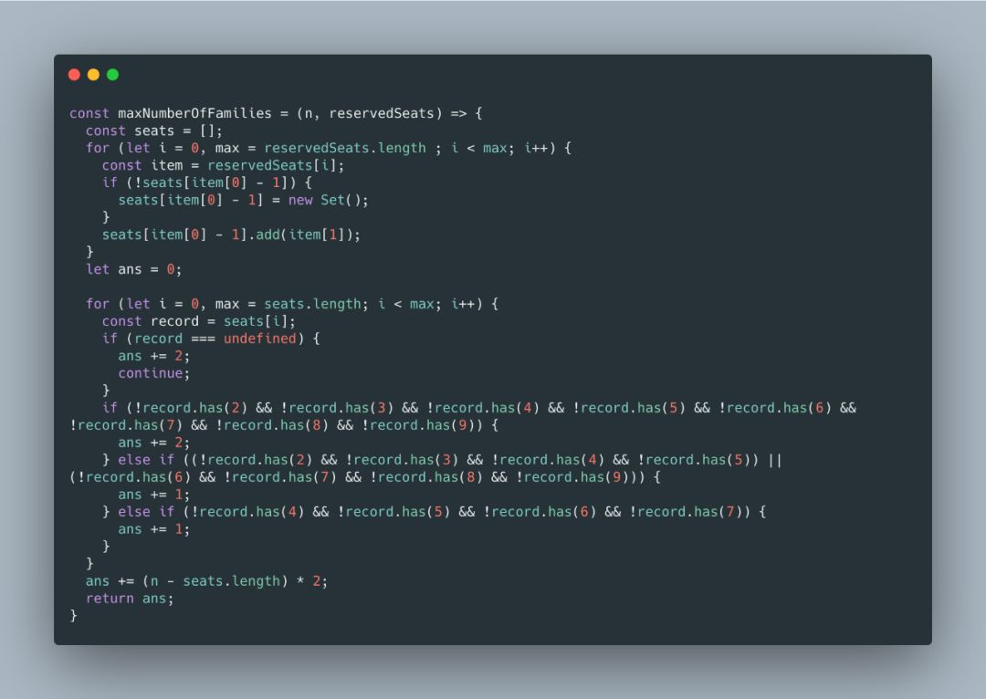 本道题有一个卡时间的点:n 的取值比 reservedSeats 长度的取值要大得多,所以需要以被占用的行数为遍历范围,对于未占用的行数 k,它能够容纳的家庭数自然是 2 * k。