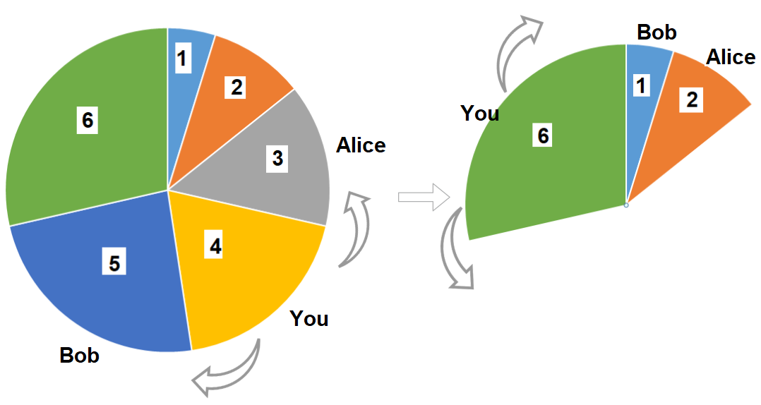 Alice 将会挑选你所选择的披萨逆时针方向的下一块披萨。