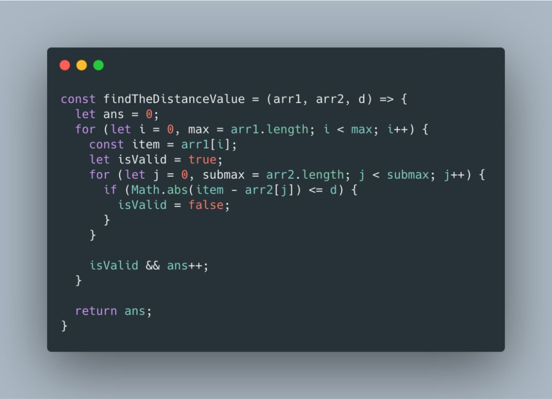 「距离值」 定义为符合此描述的元素数目:对于元素 arr1[i] ,不存在任何元素 arr2[j] 满足 |arr1[i]-arr2[j]| <= d 。
