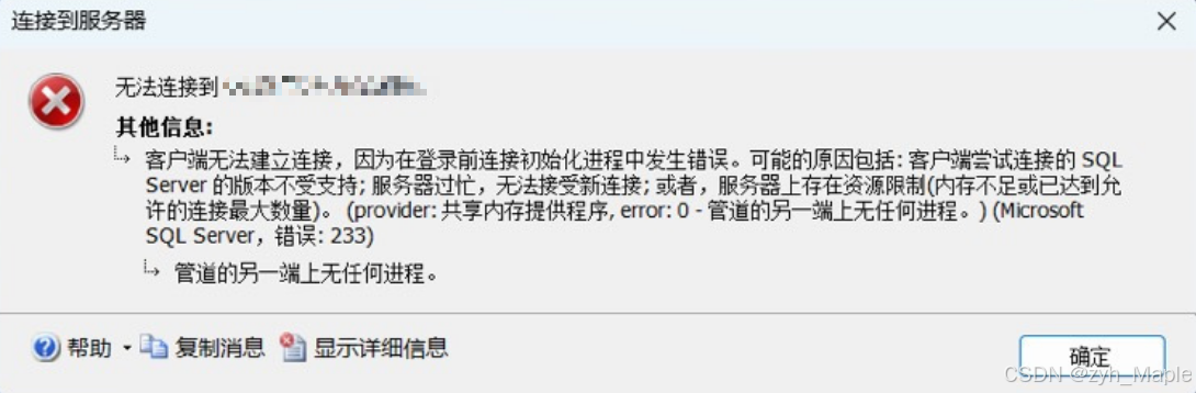 SQL Server Management Studio登录数据库报错无法建立连接,因为在登录前连接初始化进程中发生错误。可能的原因包括: 客户端尝试连接的 SQL Server 的版本不受支持; 服务器过忙,无法接受新连接; 或者,服务器上存在资源限制(内存不足或已达到允许的连接最大数量)。 (provider: Shared Memory Provider, error: 0 - 管道的另一端上无任何进程。)