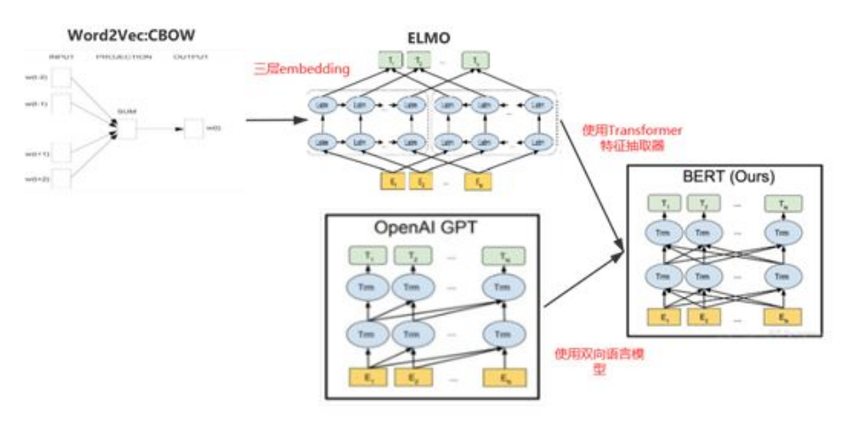 (2)、BERT与Word2Vec→ELMO→GPT之间的图结构转换