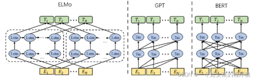 | ELMO | LSTM | ELMO采用 双向 LSTM 结构 :因为各个LSTM结构之间是互相独立的,所以可以根据上下文预测中间词; |