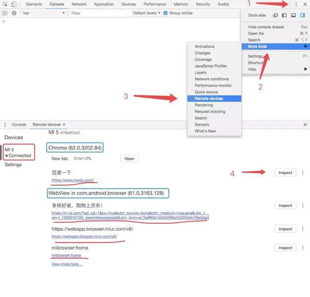 第四步:打开你电脑上的 Chrome浏览器 ,按下图标注顺序,依次点开。我使用的是 小米5,你可以看到左侧有 MI 5 已连接的字样。划线的地方分别是手机上 Chrome浏览器 和自带浏览器 WebView 下打开的页面。