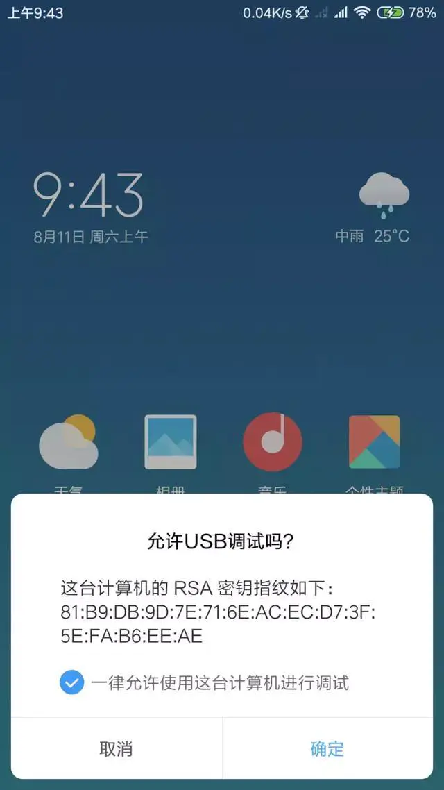 第二步:通过数据线连接你的电脑和 Android 手机,会弹出如下界面,点击 确定。