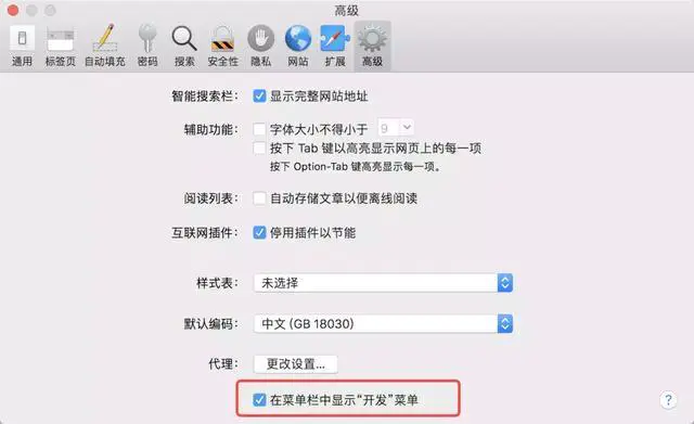 第二步: 打开 Mac 上的 Safari浏览器 > 偏好设置 > 高级 > 在菜单栏中显示“开发”菜单