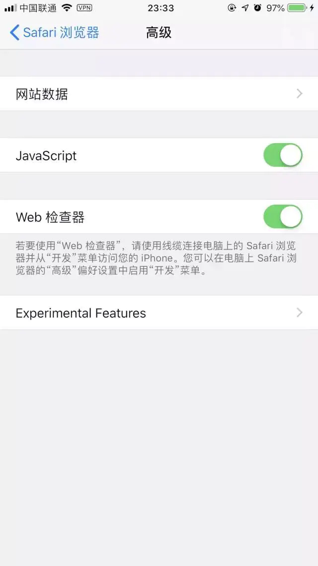 第一步:打开苹果手机 设置 > Safari浏览器 > 高级 > Web检查器