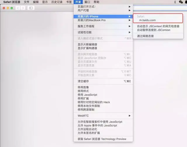 第三步: 用数据线连接你的 Mac 电脑和苹果手机,并选择信任设备。然后在手机的 Safari浏览器 中打开你需要调试的页面,并在电脑上点击下图红框的位置。